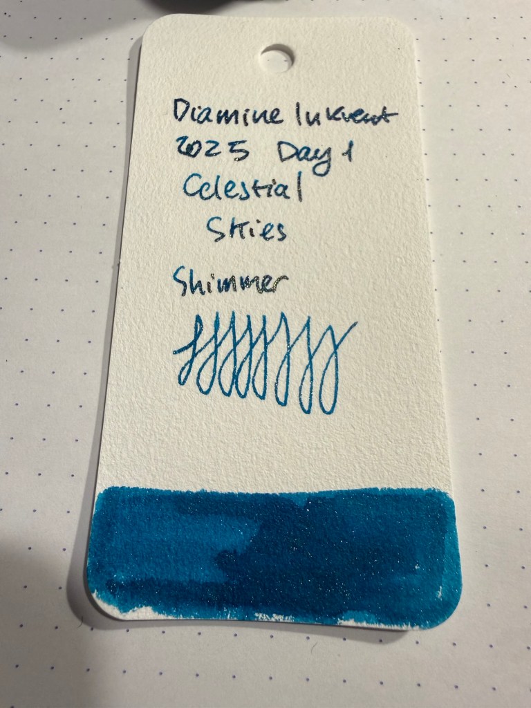 Day 1’s ink is Diamine Celestial Skies. It’s a dark, saturated teal shimmer ink with plenty of red sheen on the proper paper. It’s a festive start for the Teal Edition calendar, and I love how rich and regal this ink looks on the page.