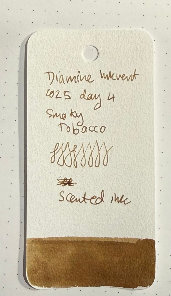I am so angry at Diamine for naming an ink after Tobacco, and then going out of their way to give us the full Tobacco experience. Here’s hoping that tomorrow’s ink is better, and that this is the last of Diamine’s scented inks, at least for this year’s Inkvent. Otherwise we might be getting a “dead rat carcass in the chimney” ink, or a “rotting wreath” one.