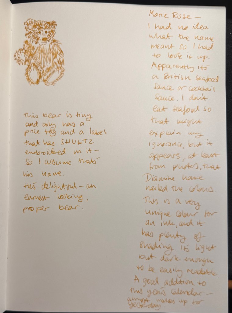 Day 5’s ink is Diamine Marie Rose, a standard ink that looks like a thousand island dressing. Apparently Marie Rose is a British seafood or cocktail sauce. I never heard of it before, likely because I don’t eat seafood. In any case the ink colour is unique and beautiful, with plenty of interesting shading.