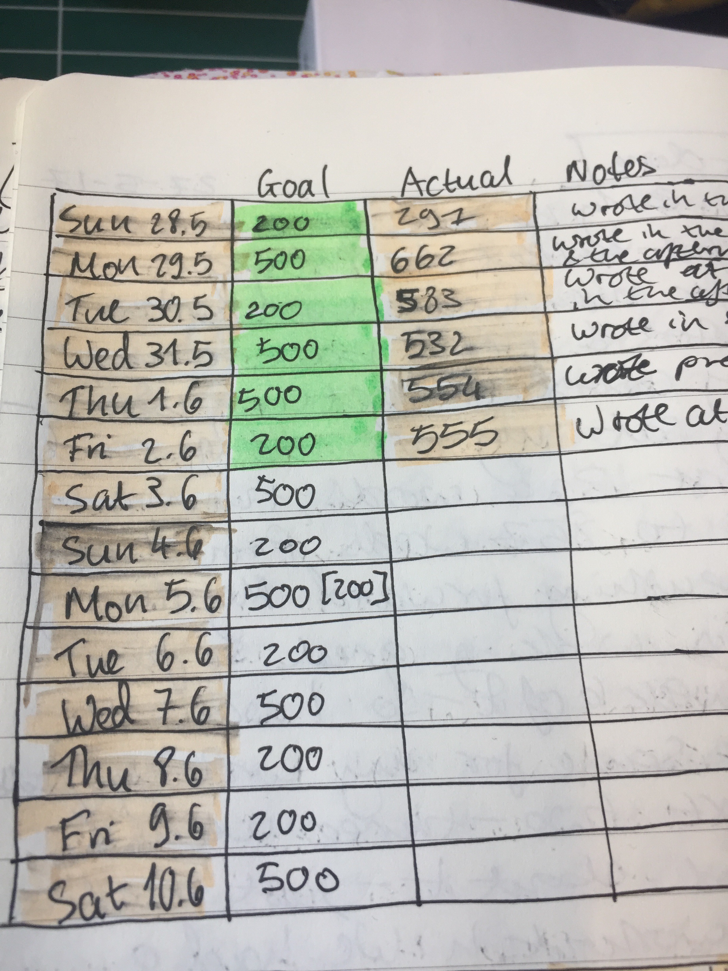 Several things didn’t go as planned this week, as I had a few unforeseen schedule changes, a bit of bad luck with my running, and a pretty bad day at work near the end of the week. As a result, both my running and my writing suffered (I missed a writing day and my long run is going to be 6k instead of 10K).