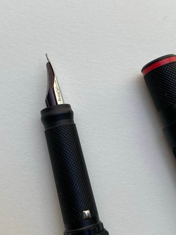 Because of the silver protrusions the pen cap snaps very securely into place. The fountain pen came with no converter, just unbranded short international cartridges, but it was easy enough to take the converter off my Super5 pen and use it here. The nib grade is indicated on the pen cap, which is what you’d expect on a drafting pencil. I like that oh so Rotring touch.