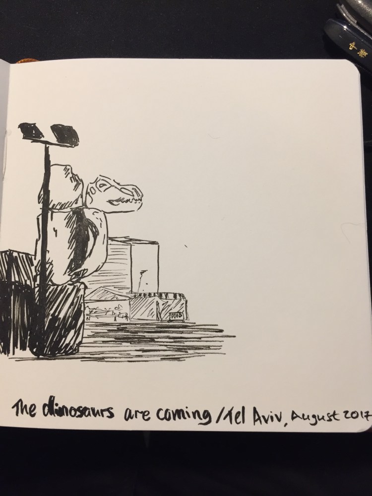 Quick sketch with zebra brush pens of the setup of a dinosaur exhibition in Tel Aviv's port.