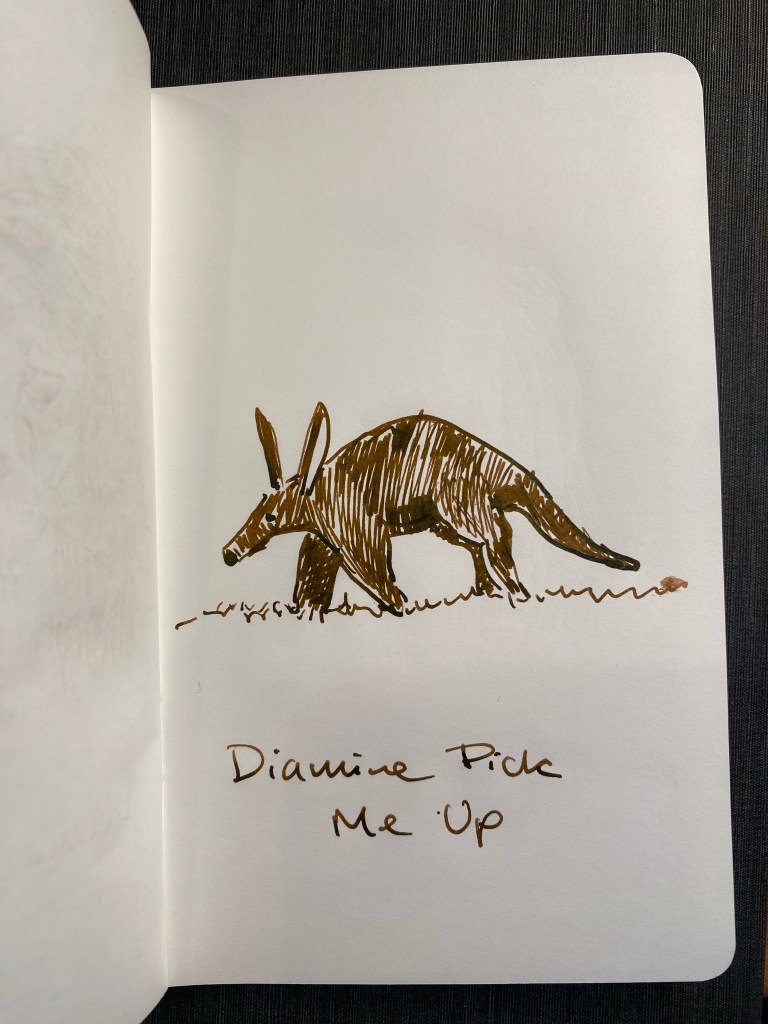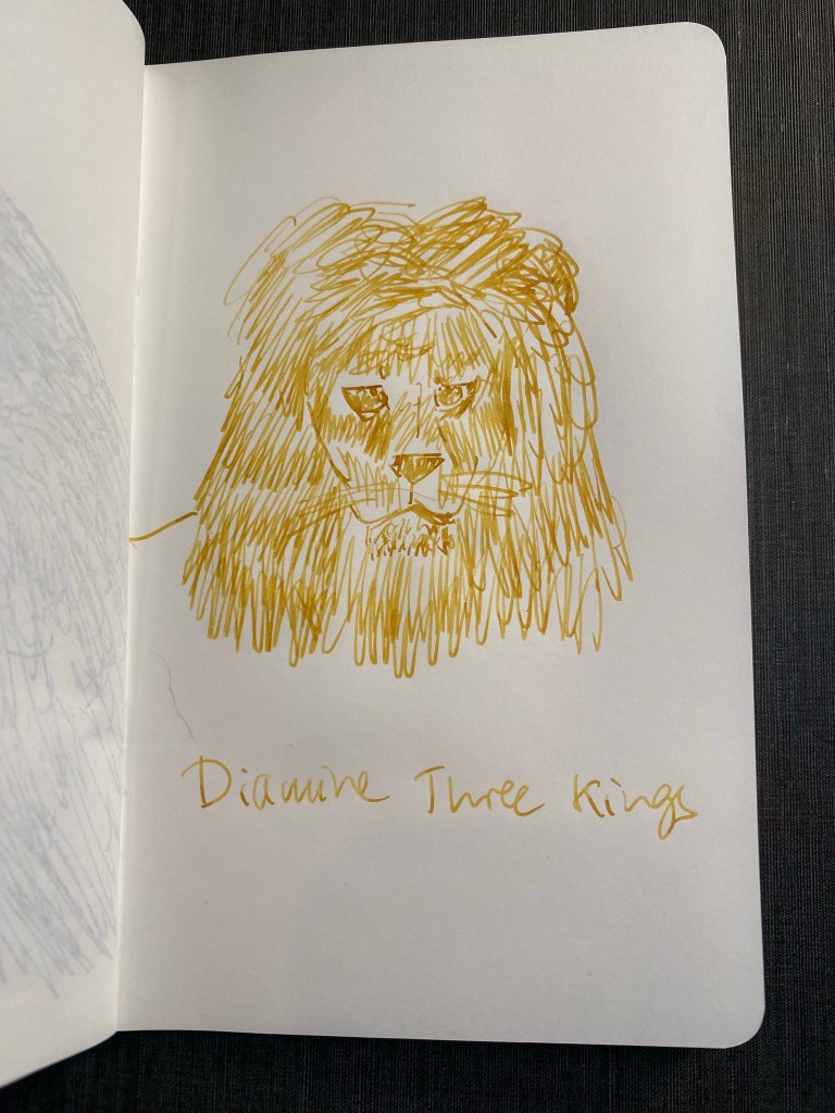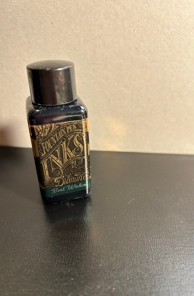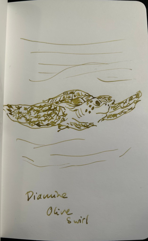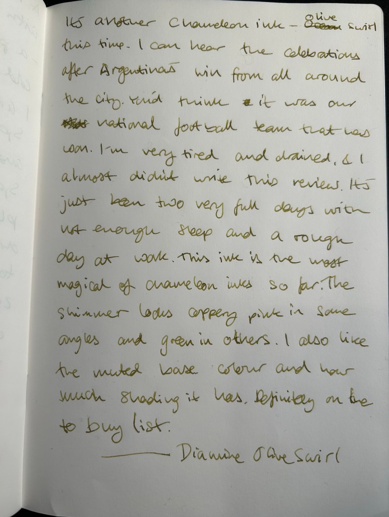 This ink takes ages to dry, because it’s so saturated. I smudged the sketch above and this writing sample took a good long time to properly dry. If you’re left handed, I’d steer well away from Diamine Best Wishes. If you like the drama, then maybe it’s the ink for you. Personally I would have preferred a lighter or more interesting green with a chameleon effect and no sheen.