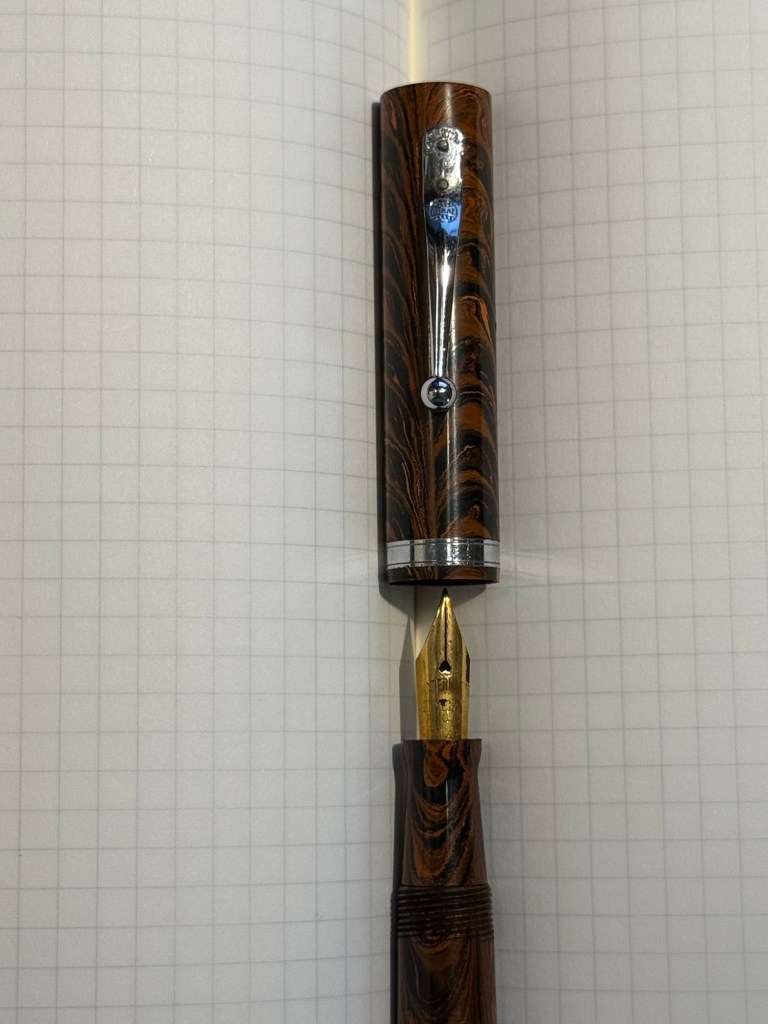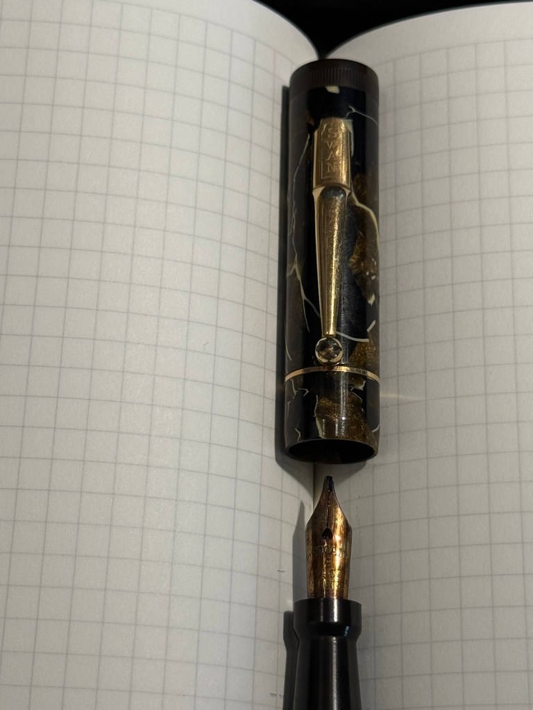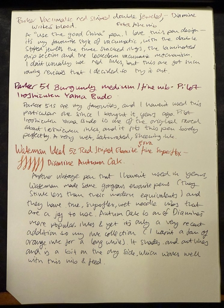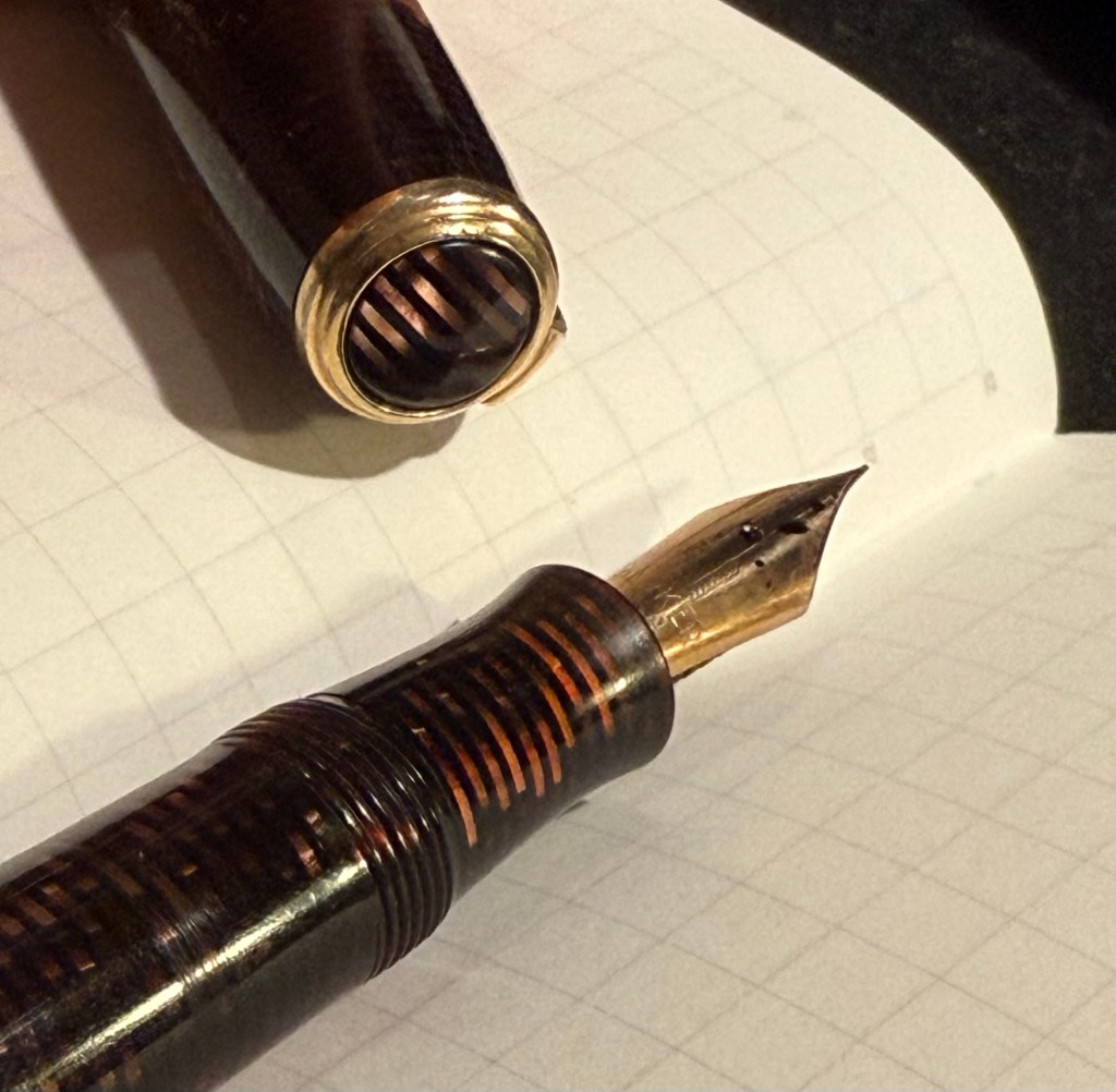 Parker Vacumatic 1st generation Laminated Burgundy Pearl Double Jewel (striped jewels, striped section) – I adore Parker Vacumatics and this is a “use the good china” pen. The grip section is also laminated (and not plain black), the body is transparent, and the nib is a sharp extra fine gold nib with a bit of character to it. It’s filled with a brand new ink for me, Diamine Writer’s Blood. I never use red inks, but this got raving reviews and seemed dark enough for me to try. I bought the ink in Oxford last year, and the pen years ago from the late Henry Simpole (Henry the Pen Man) in London. I don’t think I inked up this pen since I bought it, as it was too precious, and I still won’t let it leave the house, but I am looking forward to actually using it.