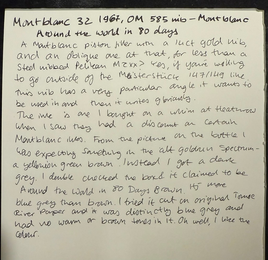 Montblanc 32 (1967) OM 585 nib – heavens, you can get a gold nibbed, piston filling original Montblanc with an Oblique Medium nib for less than a steel nibbed Pelian M2xx costs? Yes, you can. I love the design of this pen (you can read about it more here) and the nib is great… provided you write in the exact angle it expects. The Swan’s nib is generous in terms of the writing angles it accepts, and the Monblanc 32 is demanding: you will use the nib at the precise angle it is designed for, or it will not work at all! I only wish that the Montblanc Around the World in 80 Days ink was so exact. From the description and the illustration on the box I was expecting a brownish gold ink, maybe with a hint of green. In reality I got a dark, cold grey ink, with a hint of blue to it. No brown, no gold, nothing at all to do with the elephant illustration on the box. I had to double check just to make sure that I hadn’t landed on a bad bottle by chance.