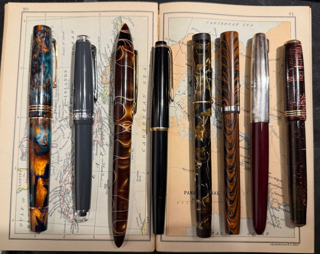 The pens from left to right: Leonardo Momento Zero Bohemian Twilight, Sailor Pro Gear Slim Graphite Lighthouse, Edison Nouveau Premiere Cappuccino, Montblanc 32, Mabie Todd Swan L2 Leverless pen, Waterman 52, Parker 51, Parker Vacumatic Standard double striped jewel.