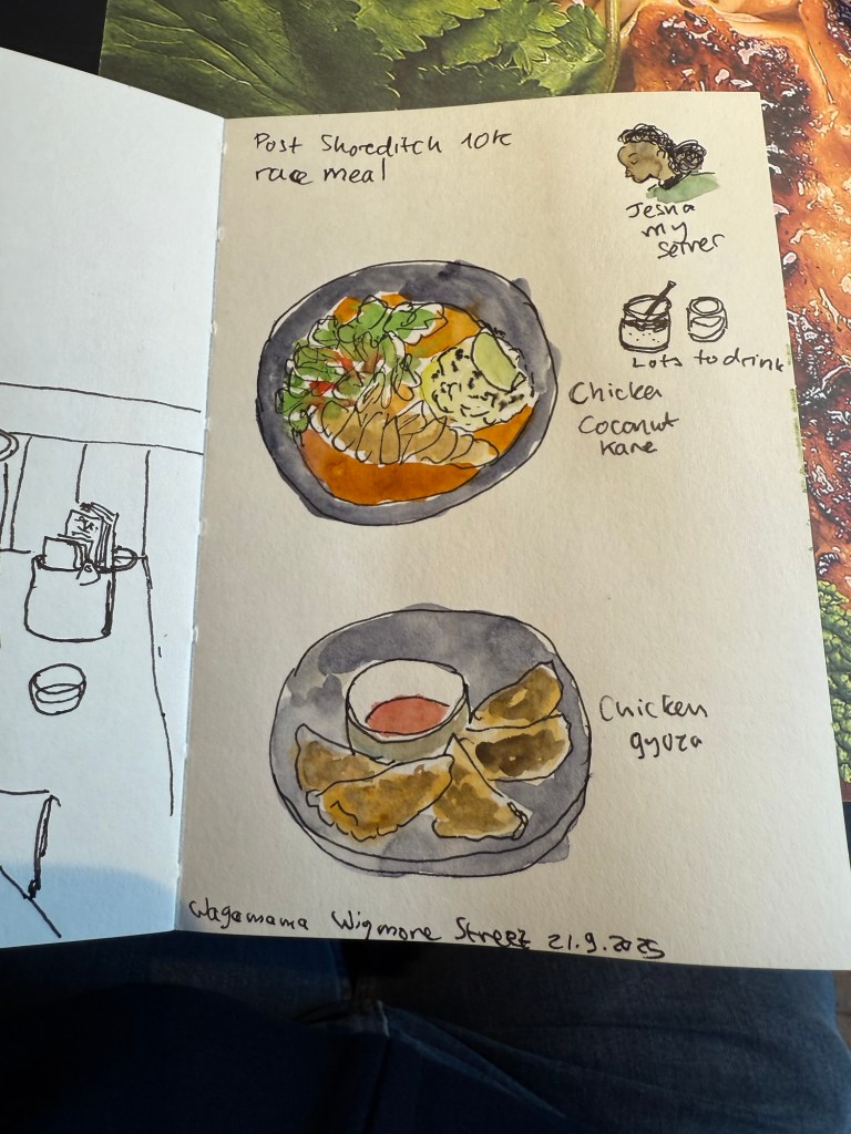 After the race I went for a celebratory meal at Wagamama. I hadn’t had breakfast and I was parched so I had a ton to drink and tried one of their new curries. Jesna, my server, was really curious about the sketches and we got to talk a bit.