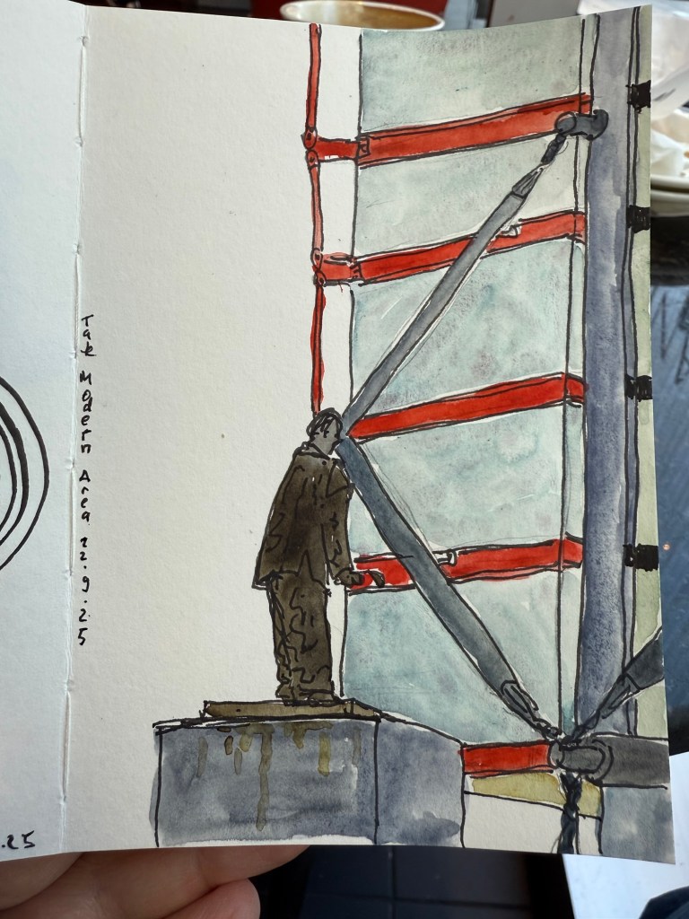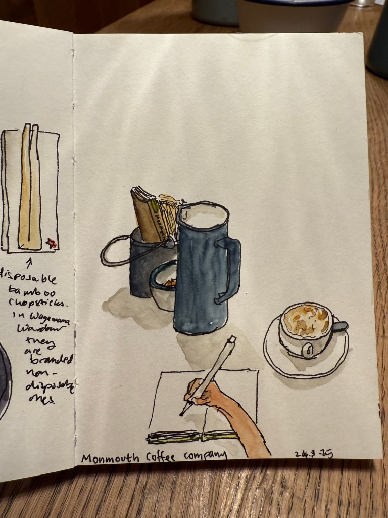 I had a coffee at the Monmouth Coffee Company. I love their coffee, but the place was both packed and super hot and stuffy so I made this quick sketch in my Pith Kabosu sketchbook and didn’t bother to add watercolour to it. It’s the first time I tried a POV sketch, and you can see the weird way I oftentimes hold my pen. I got to talk to a super nice young South Korean woman, as I shared the table with her and a young Japanese father and his 4 year old son.