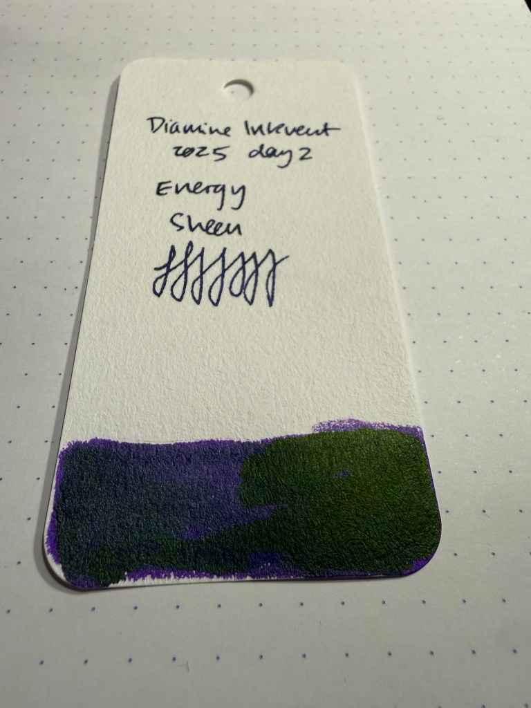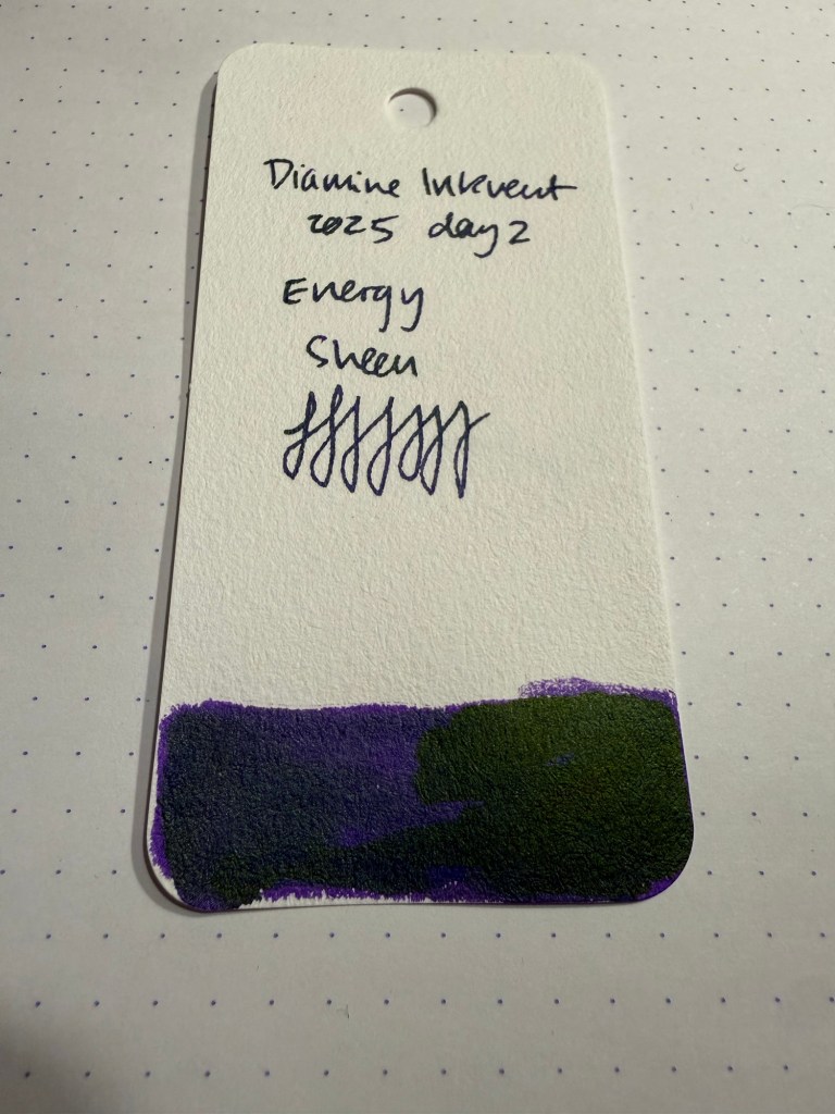 Day 2’s ink is Diamine Energy, a purple ink with golden green sheen. I used a Lamy Safari with a medium nib to test this ink out. The ink is very saturated, as I’d expect from a sheening ink, but there’s so much green sheen on it that it makes the ink look dusty.