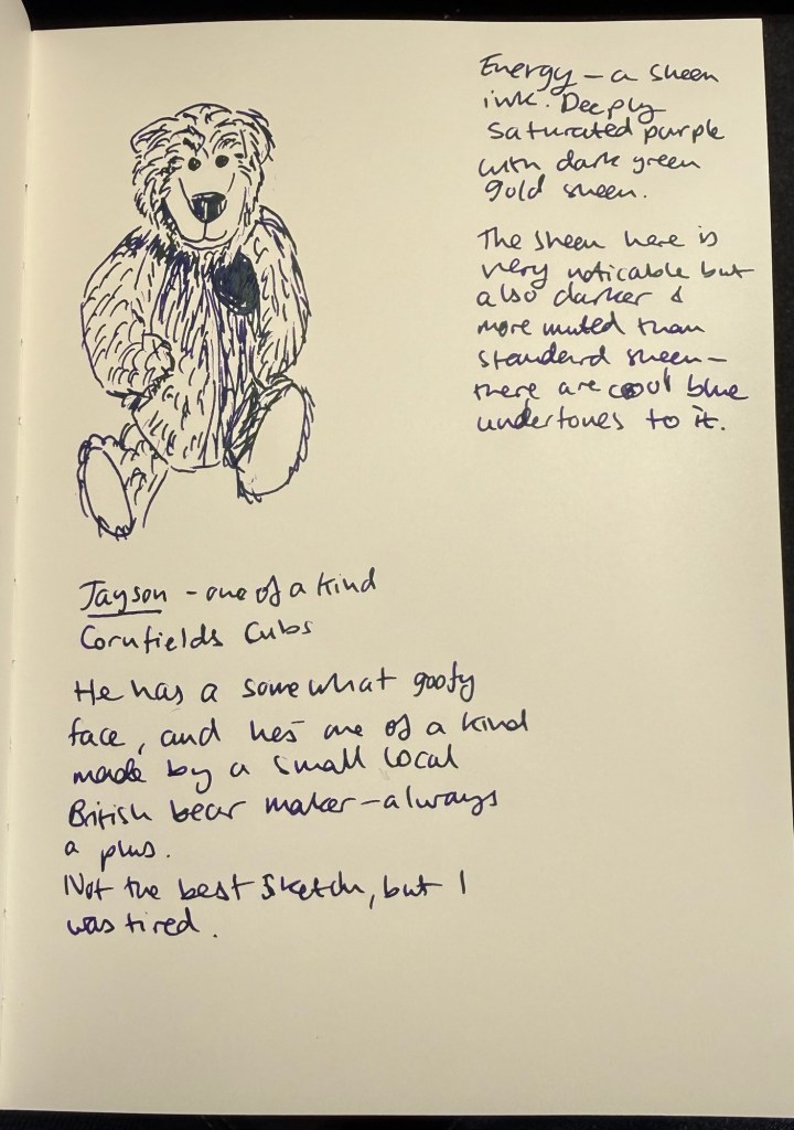 The sheen is interesting – there’s a cooler, bluish undertone to it that makes it more dusky and more muted than the standard golden green sheen that usually appears in dark purple inks.