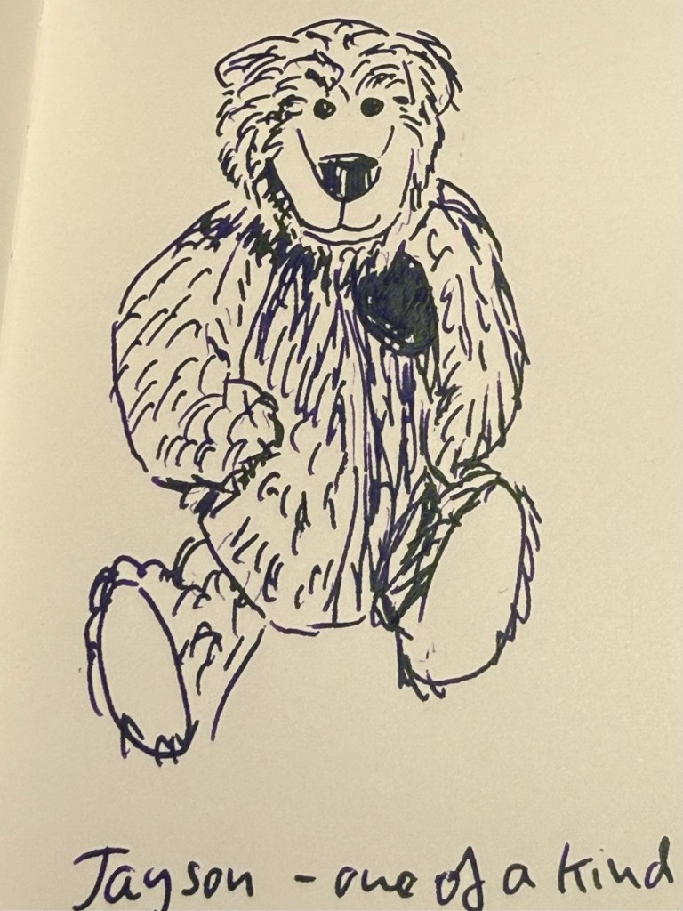 Today’s bear is Jayson. He’s literally one-of-a-kind – an artist bear made by Cornfield Cubs. He’s got a bit of a goofy face, which is why I bought him.